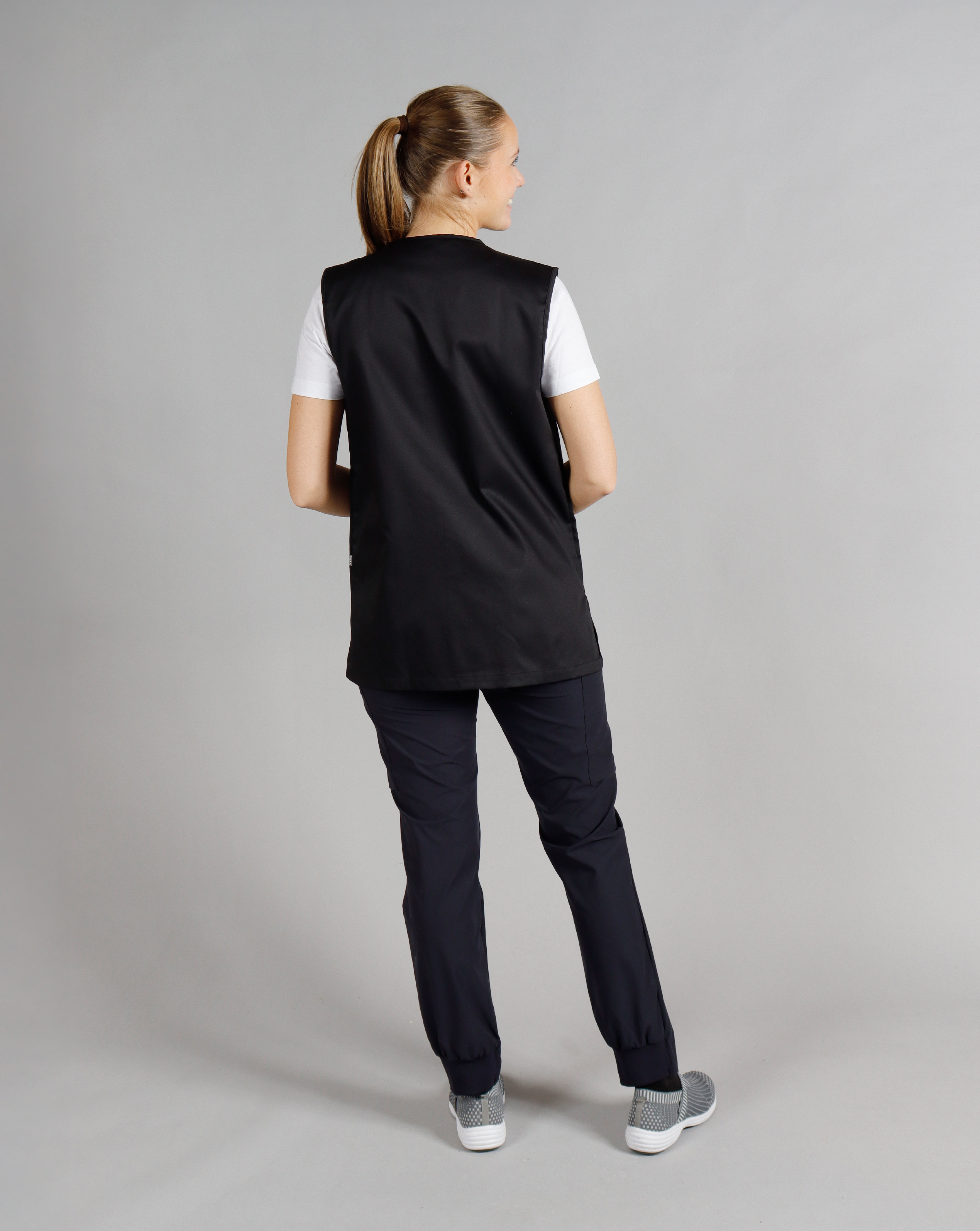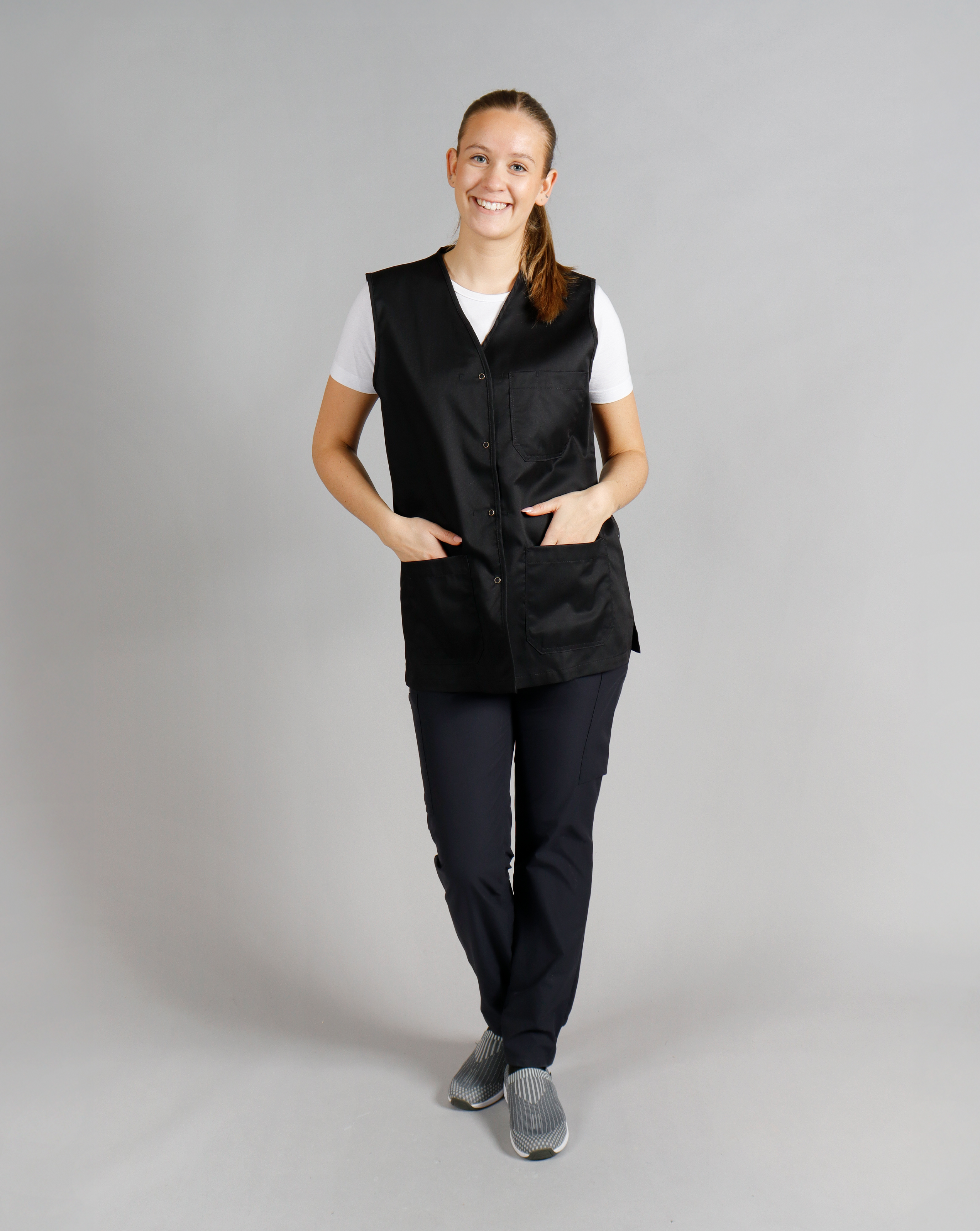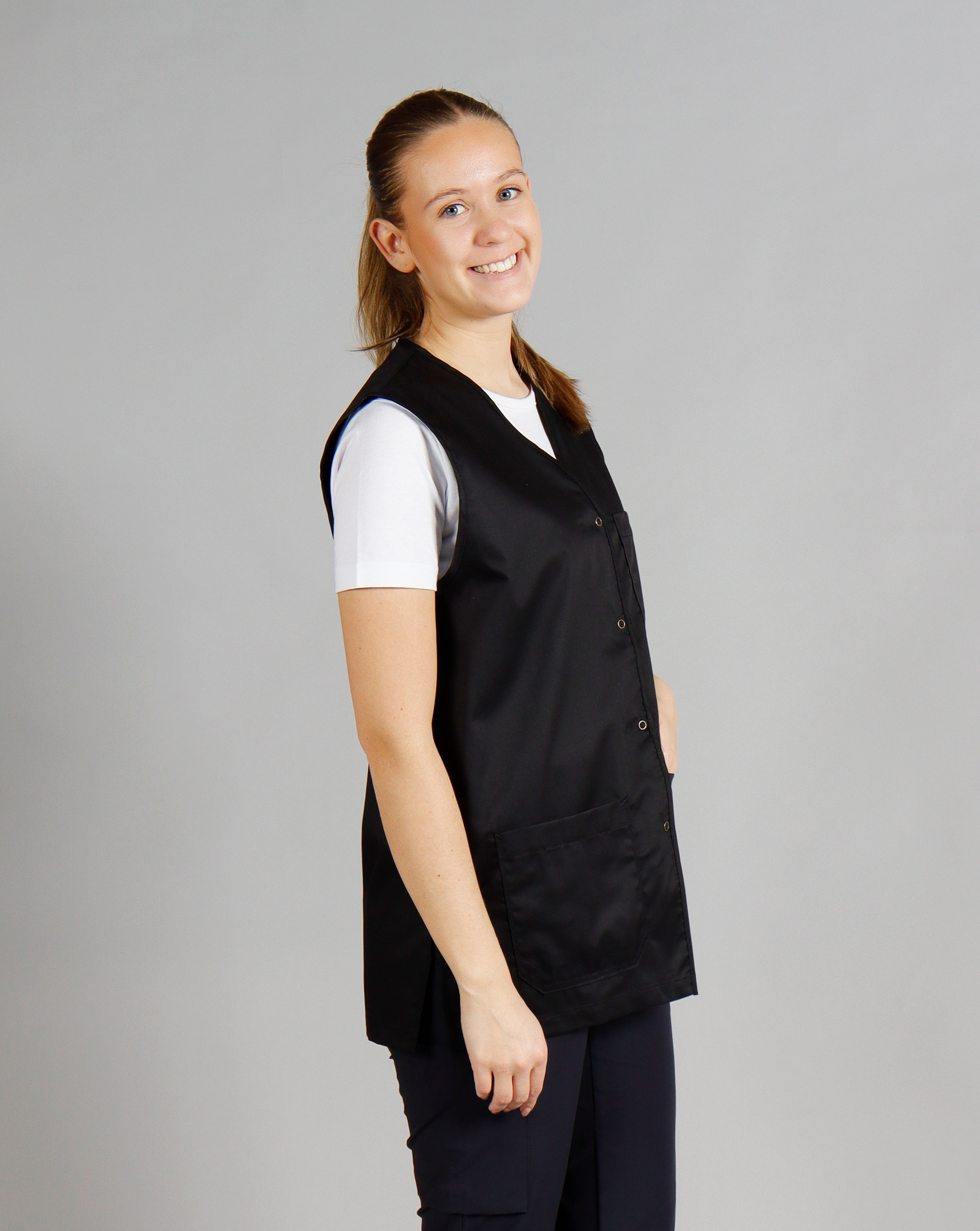 Diese zeitlose Weste im Unisex-Schnitt eignet sich perfekt für Männer und Frauen im Pflege- und Servicebereich. Mit Druckknopfverschluss, einer großen geteilten Brusttasche und zwei geräumigen Hüfttaschen – eine davon mit Handytasche – sind alle wichtigen Utensilien stets griffbereit. Die Weste reicht über die Hüfte und bietet durch seitliche Schlitze zusätzlichen Komfort und Bewegungsfreiheit.