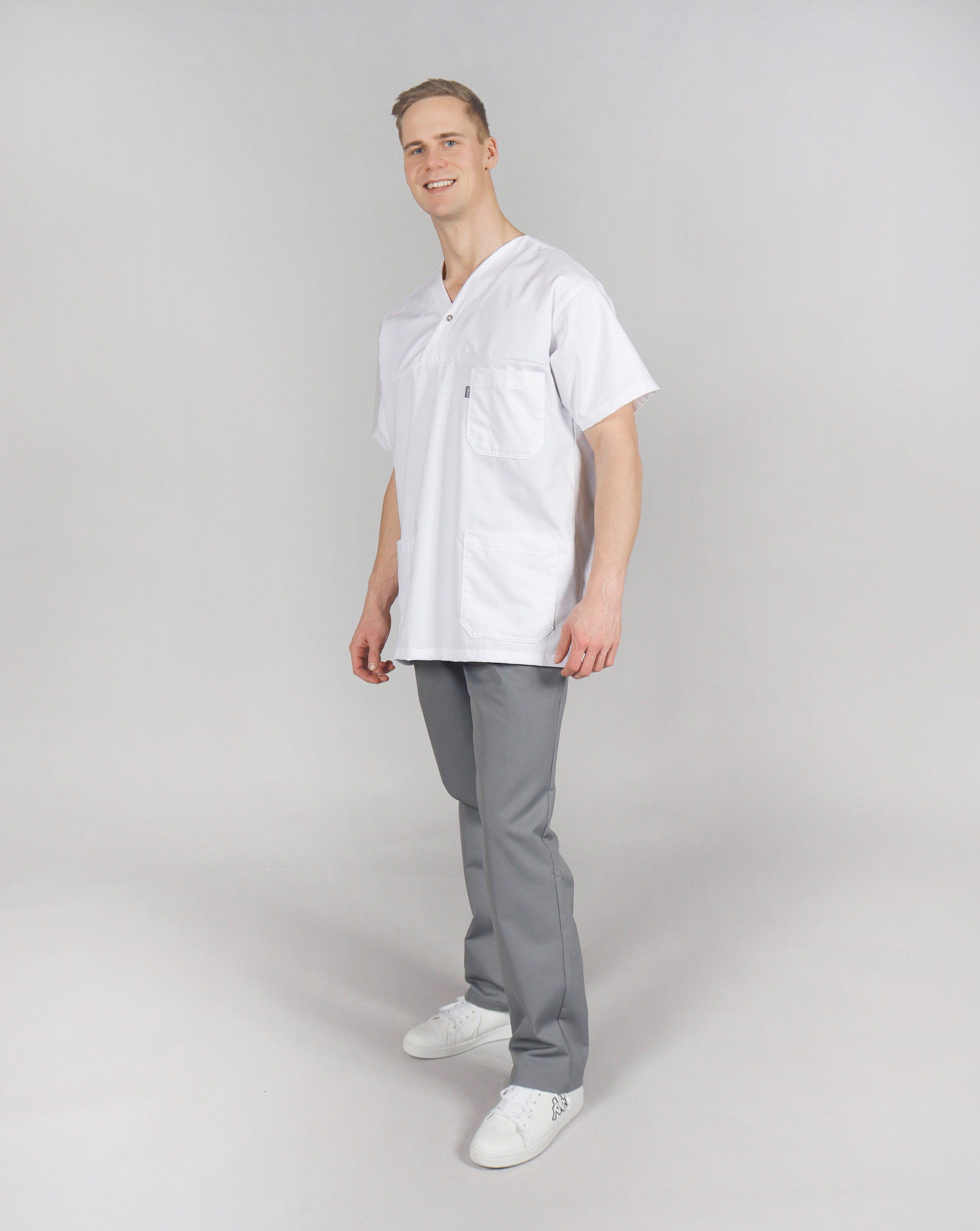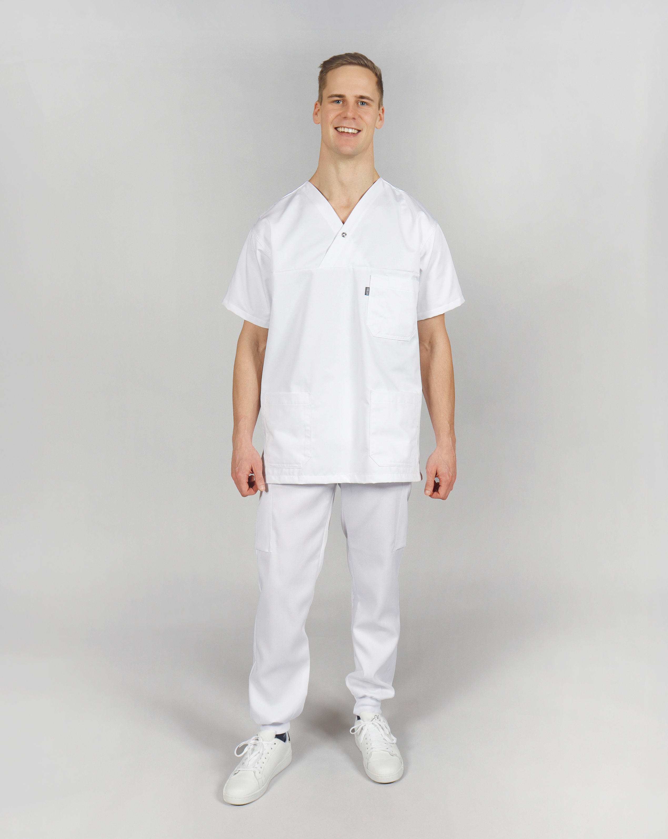 This men’s smock is designed for both functionality and all-day comfort. It features two spacious hip pockets and a chest pocket with an integrated pen slot on the left side. The classic V-neck closes with a snap button with glossy white cap. Side slits provide extra freedom of movement and ensure a good fit. The soft fabric with cotton on the inside feels great against the skin – ideal for long shifts.