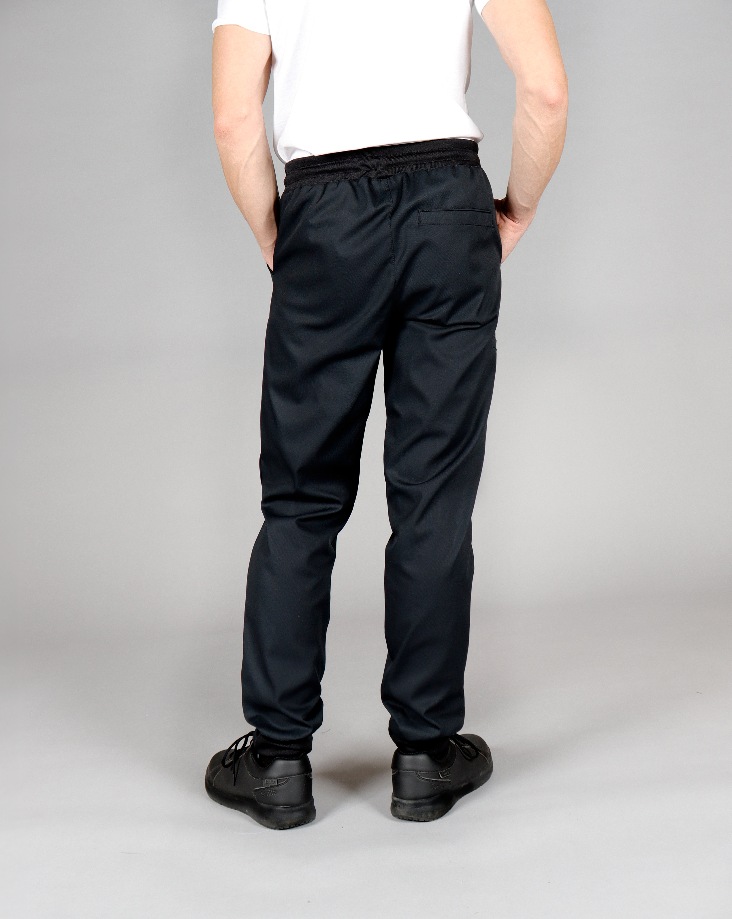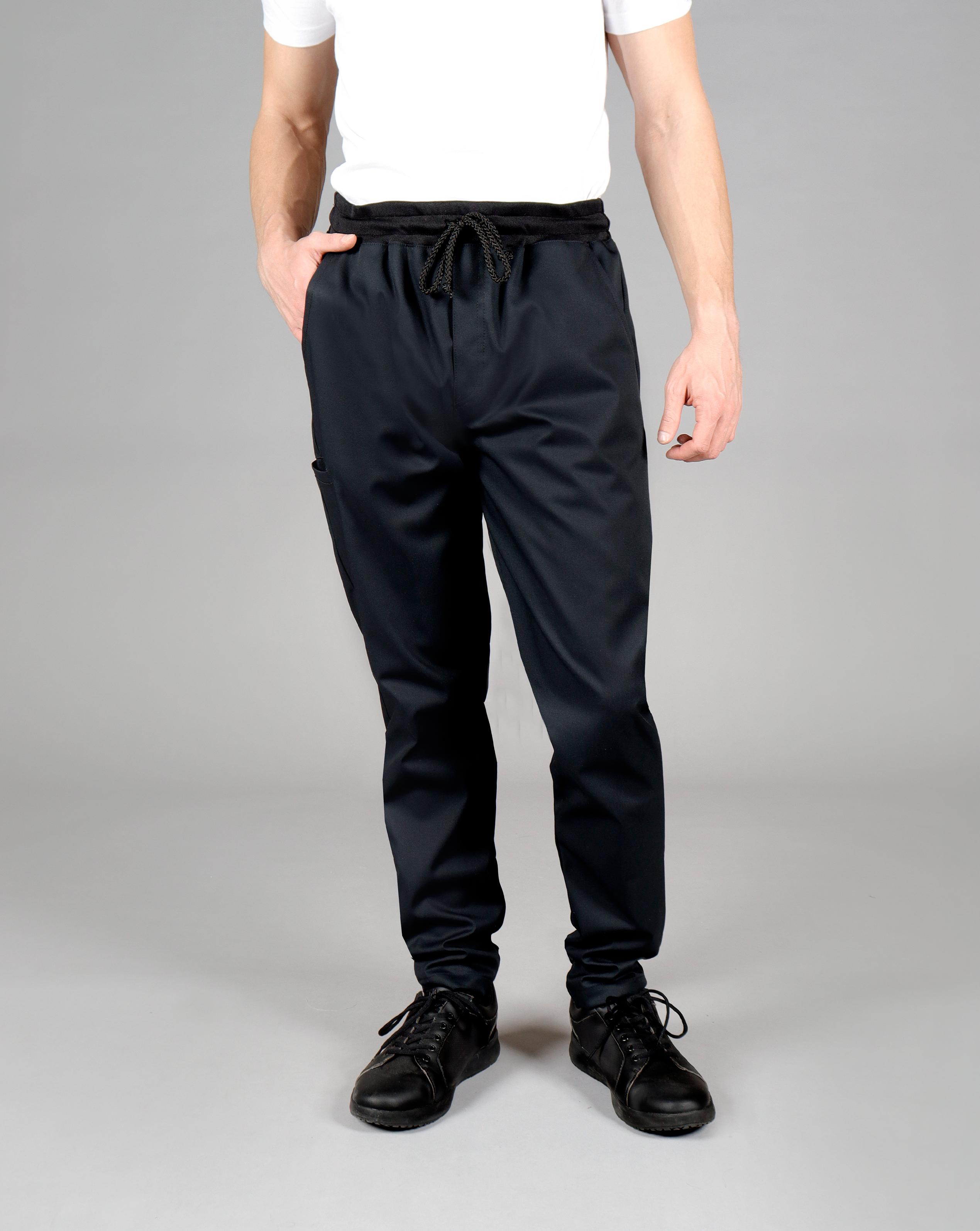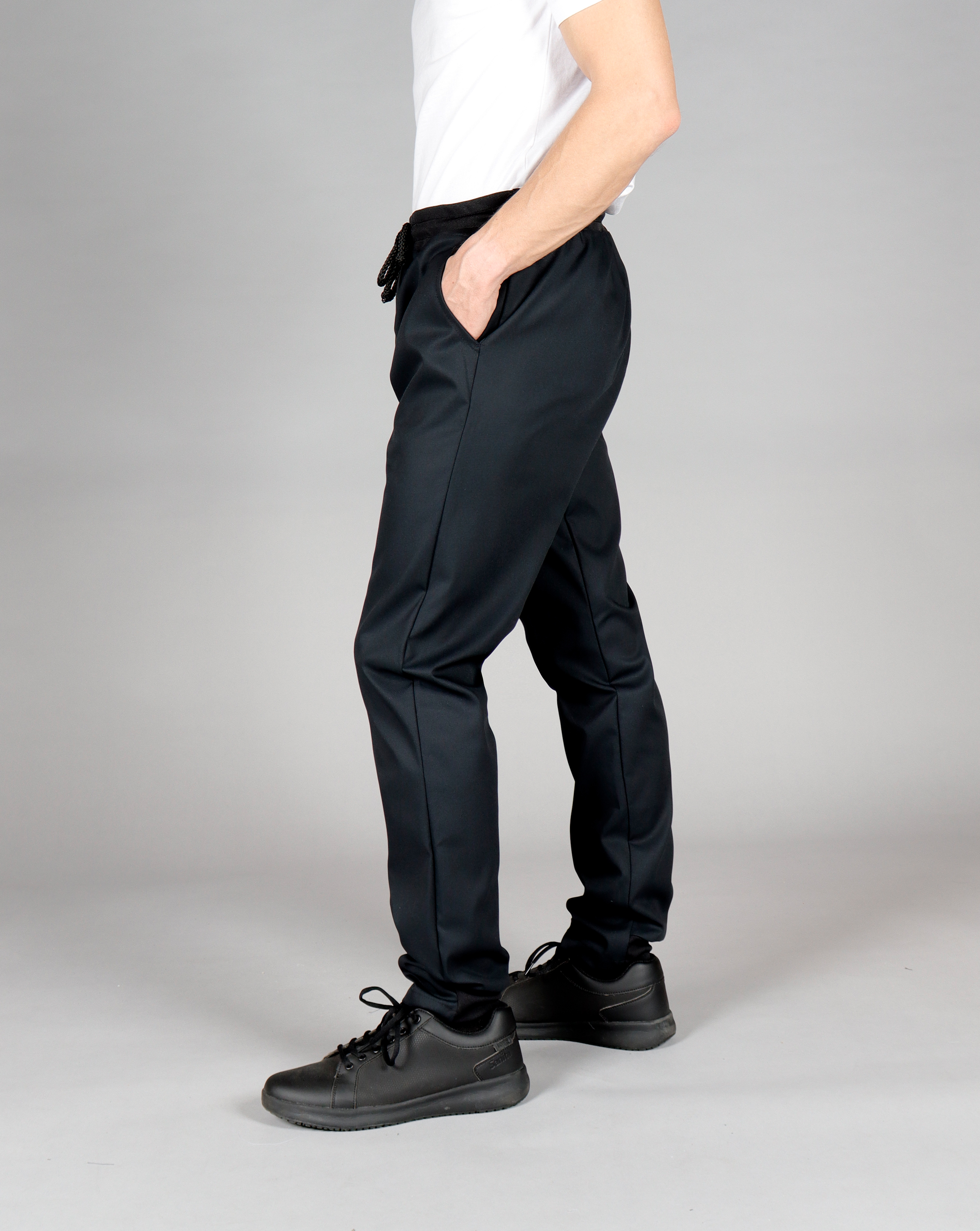 A modern and comfortable take on classic chef pants. Relaxed fit at the top and tapered from the knee down, ideal for busy kitchens and stylish guest-facing roles. Ribbed waistband with drawstring and ribbed back cuffs ensure comfort and mobility. Practical pockets complete the functional design.