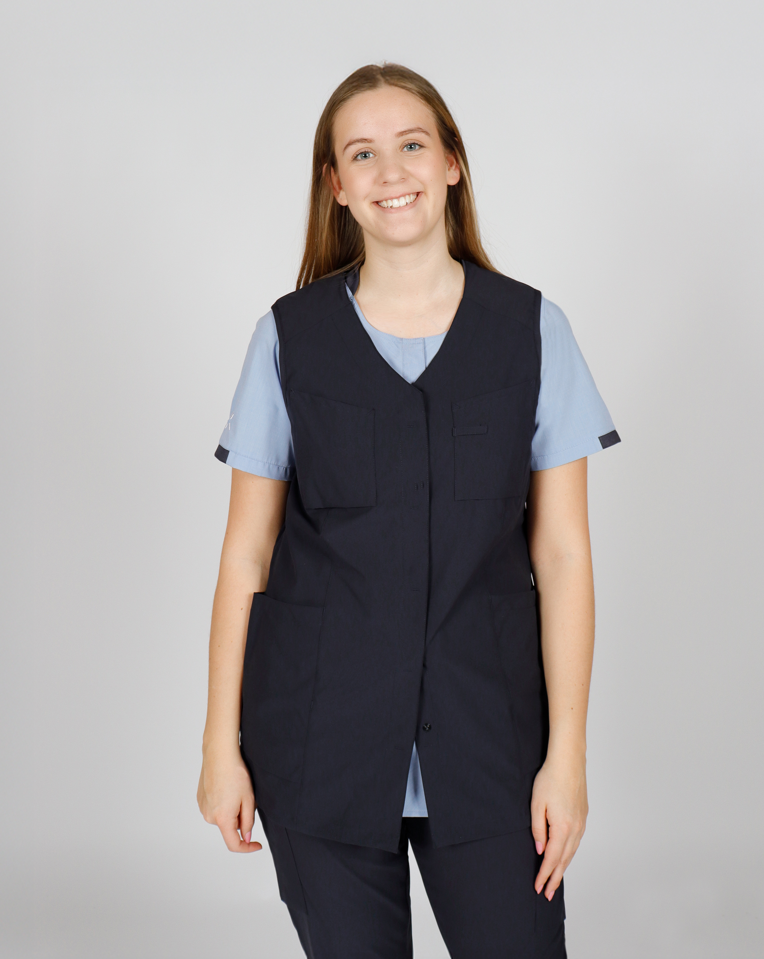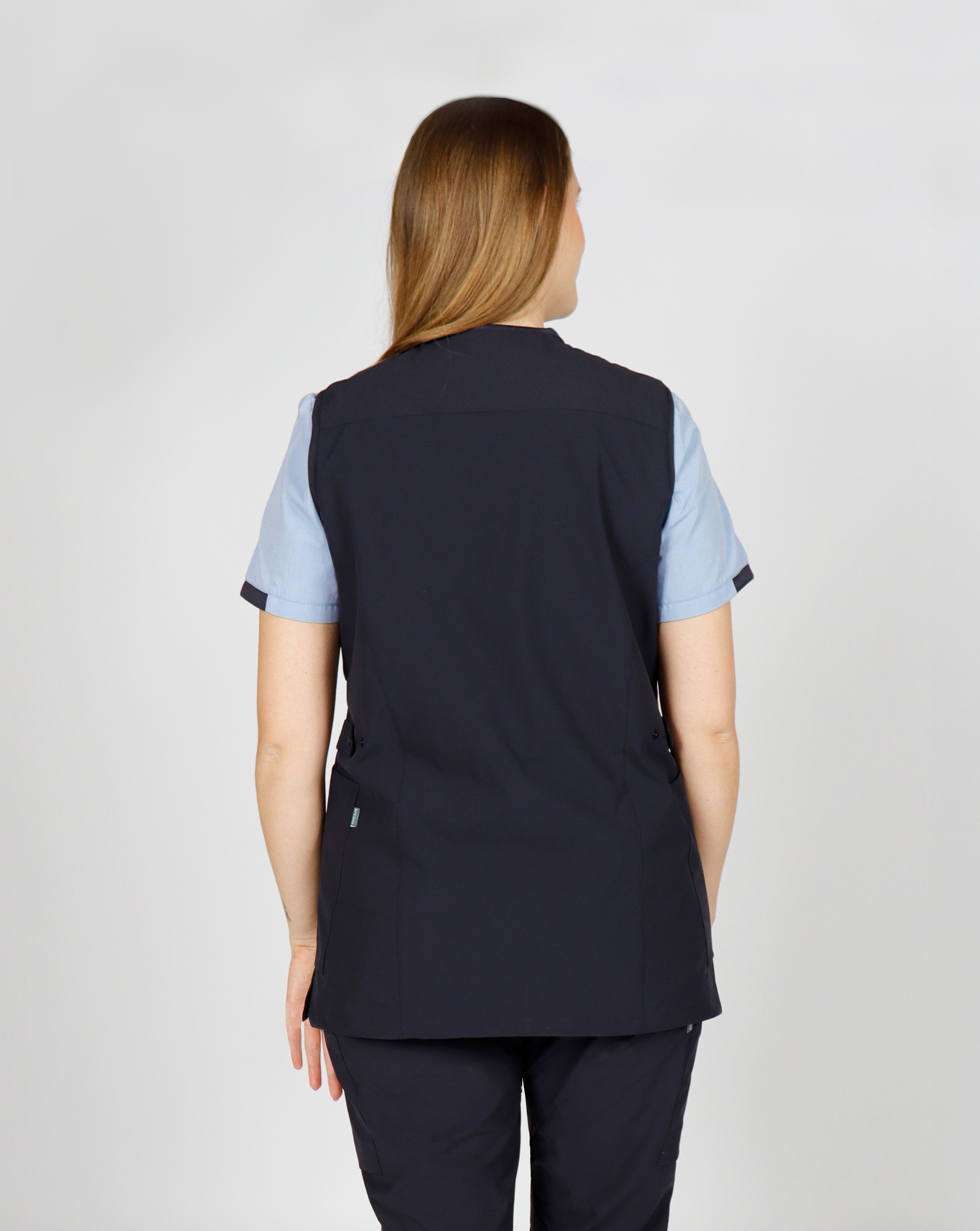 This light and versatile multi-stretch vest is tailored for maximum comfort during busy workdays. The flattering V-neckline is ergonomically shaped to rest comfortably around the neck and shoulders. Hidden snap buttons are ideal for dementia care settings. Large 3D-effect hip pockets include mobile phone pockets and straps for keys and ID cards. Adjustable back straps and side slits provide improved movement and fit.
