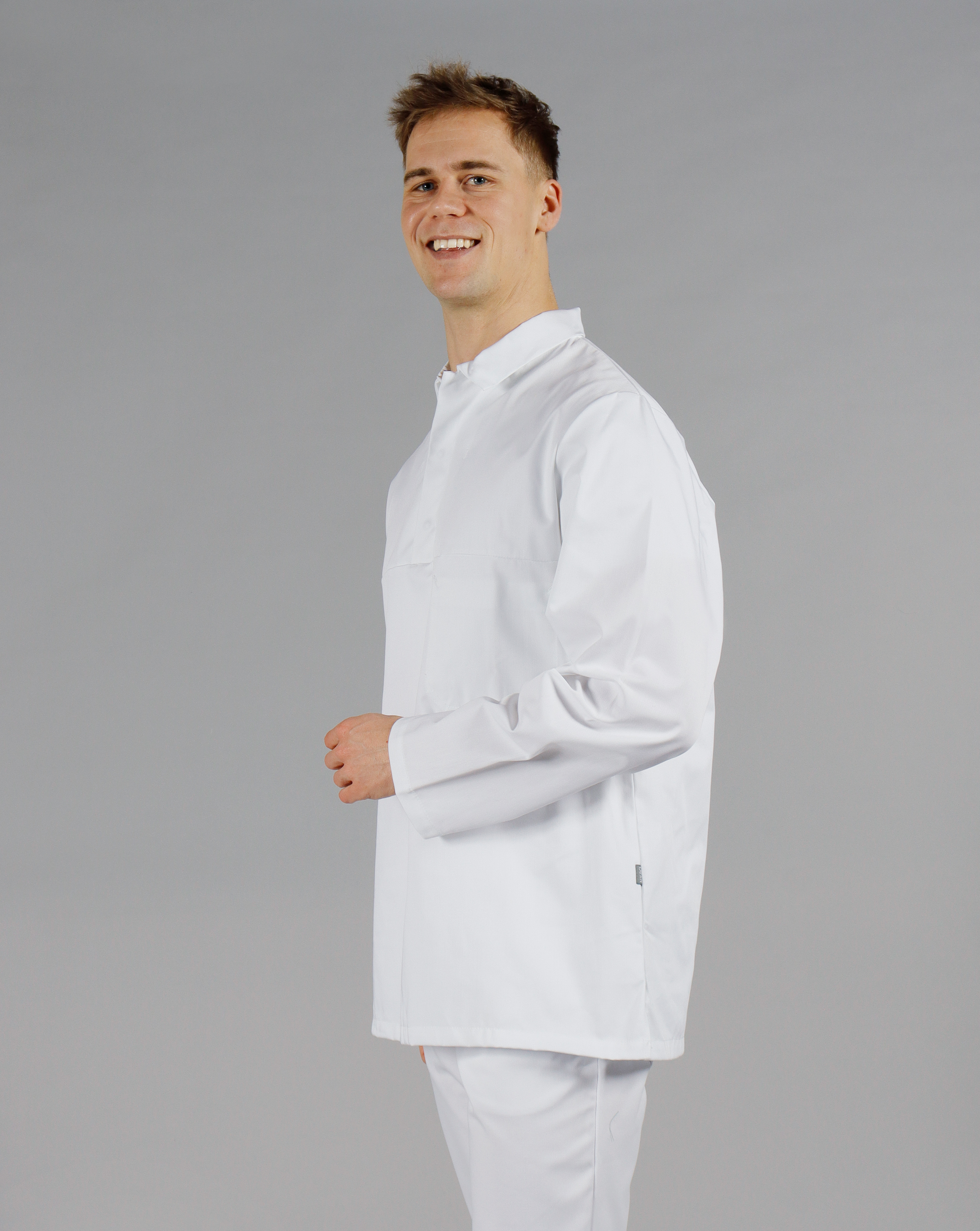 This tunic is developed for the food industry and complies with DIN 10524 standards. It features a classic revers, hidden press button closure and adjustable sleeve openings. The internal chest pocket follows official guidelines, and the straight-cut fit provides good coverage at the back. The fabric is suitable for industrial washing at high temperatures.