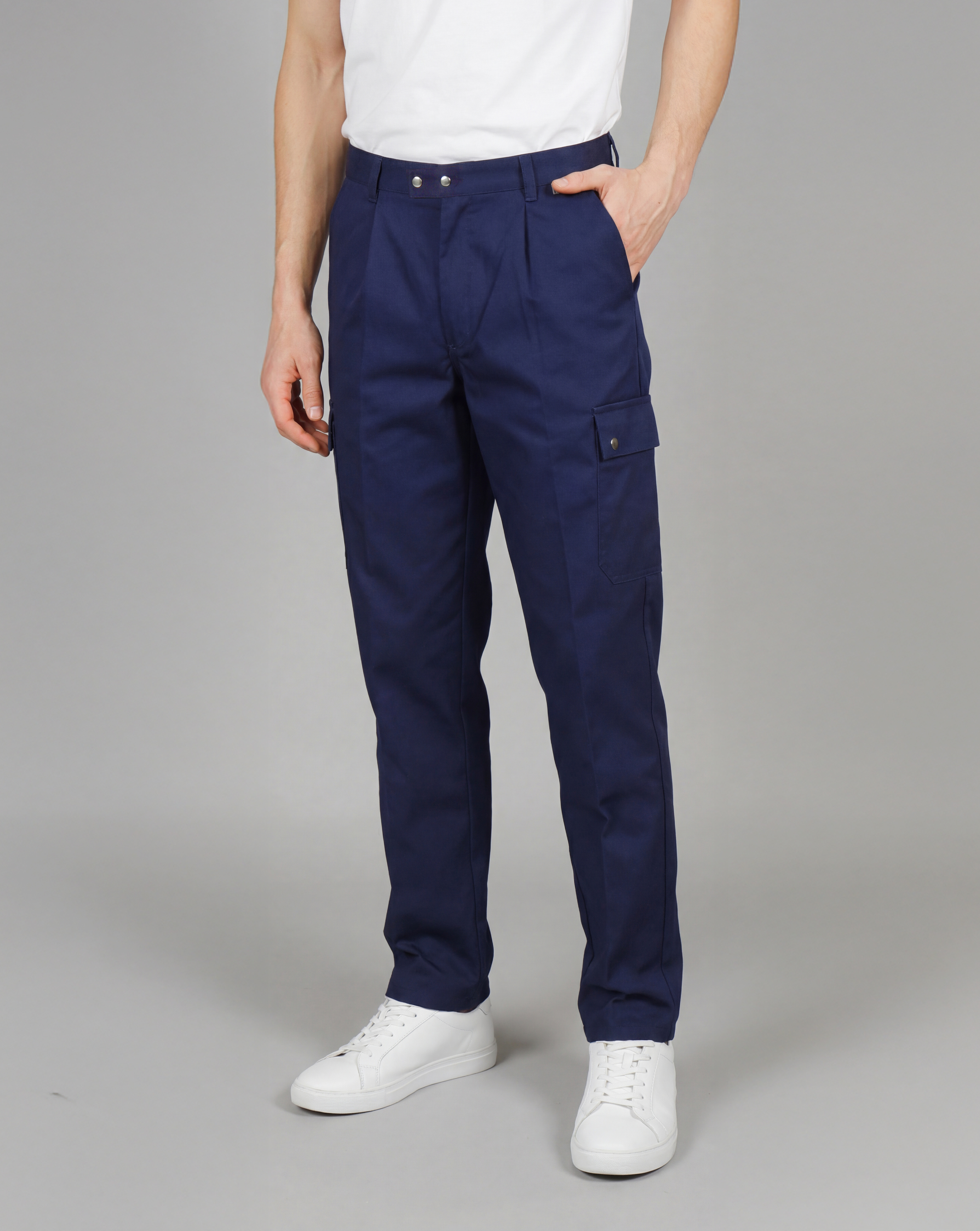 Diese praktische Arbeitshose vereint klassischen Schnitt mit moderner Funktionalität. Das robuste Material sorgt für eine lange Lebensdauer – ideal für einen aktiven Arbeitstag. Der Bund ist innen verstellbar und bietet zusätzlichen Tragekomfort. Eine Handytasche mit Druckknopfband befindet sich am linken Oberschenkel, während der rechte Oberschenkel eine zusätzliche Tasche bietet. Tiefe Seitentaschen, eine Gesäßtasche und stabile Gürtelschlaufen runden das Design ab.