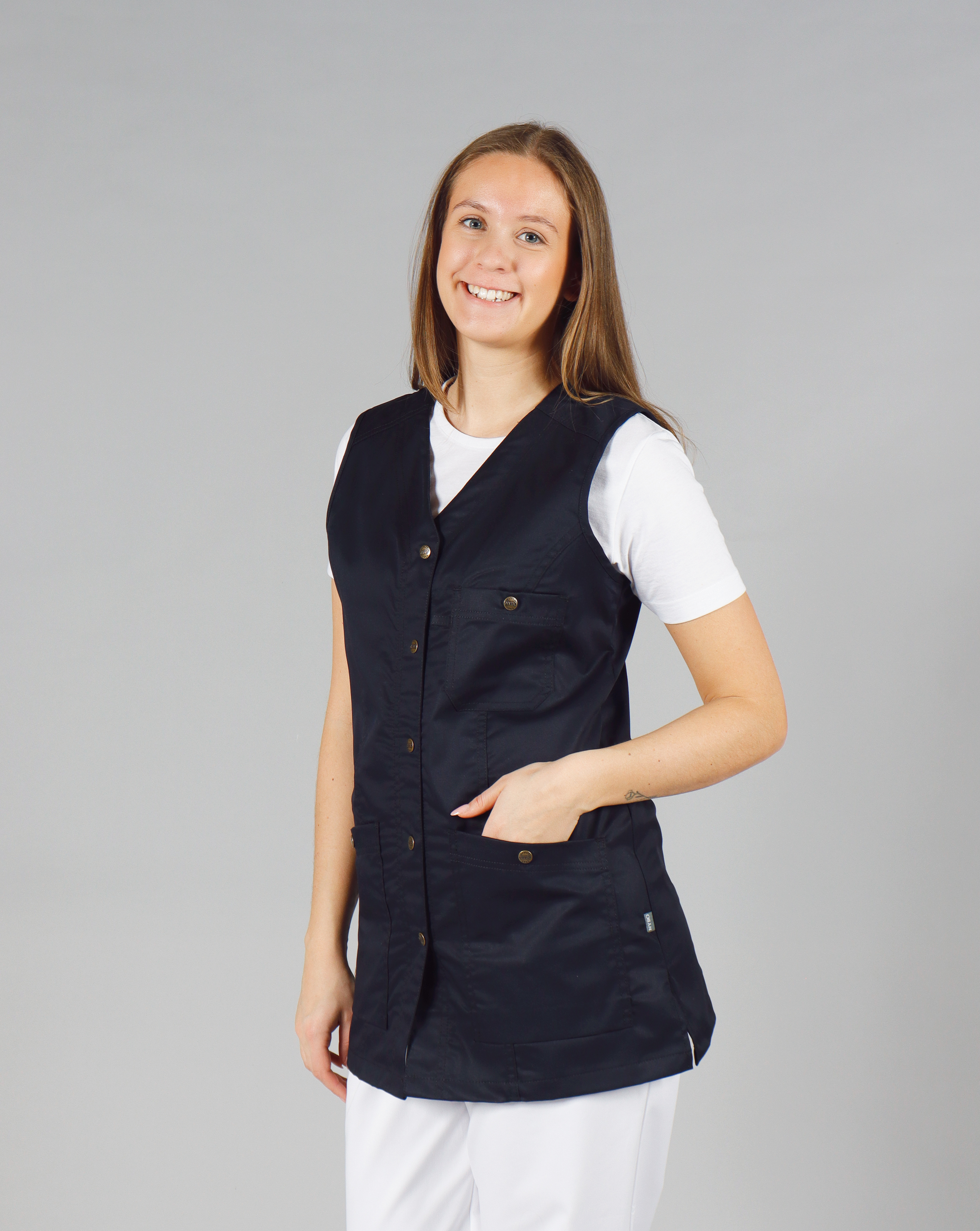 This versatile and flattering women’s vest is designed with a practical V-neck for improved comfort throughout the day. Featuring large lockable 3D hip pockets, an inner mobile pocket, key straps, and a functional chest pocket with pen and ID-card holder. The vest has adjustable back straps and side slits for better fit and freedom of movement.