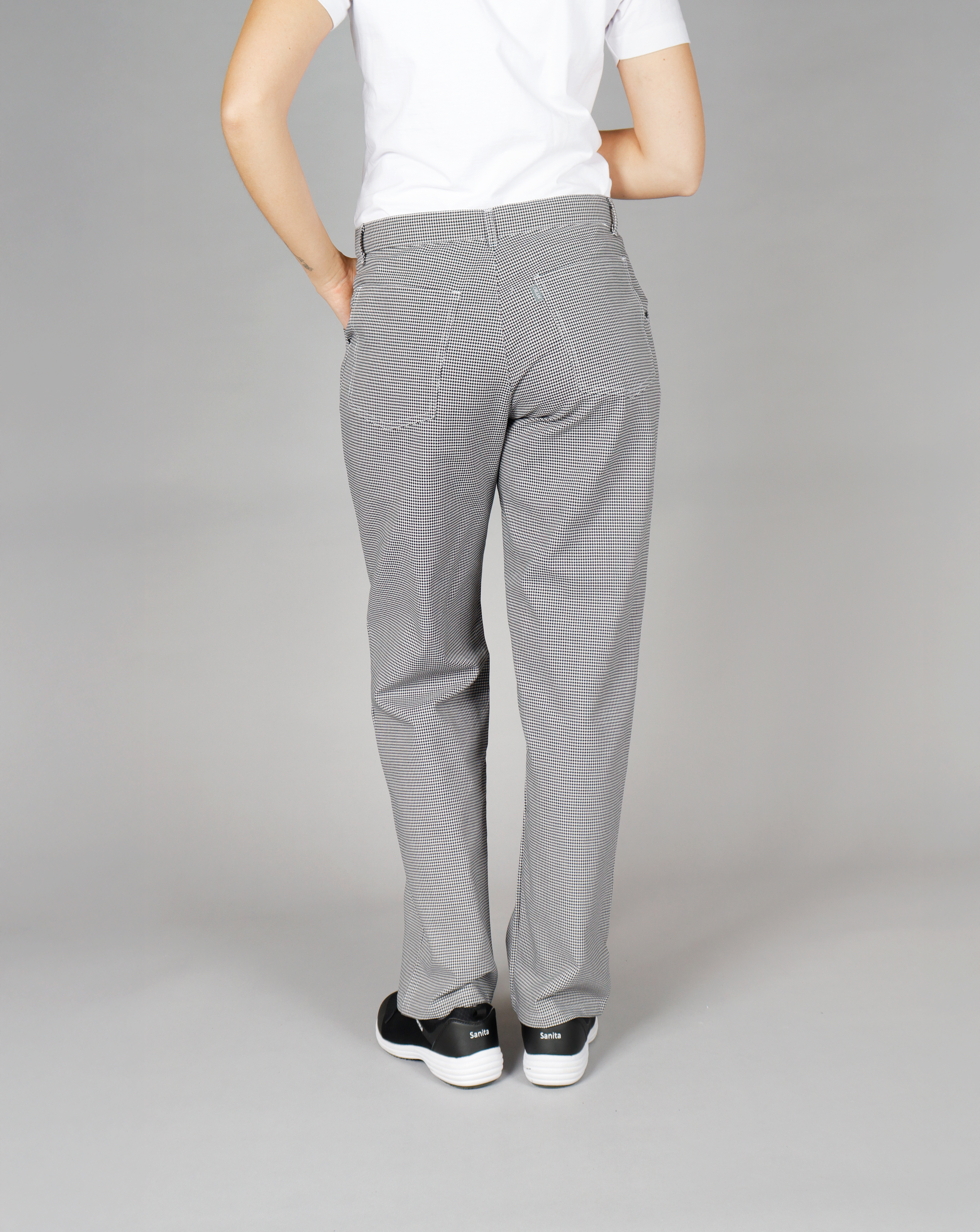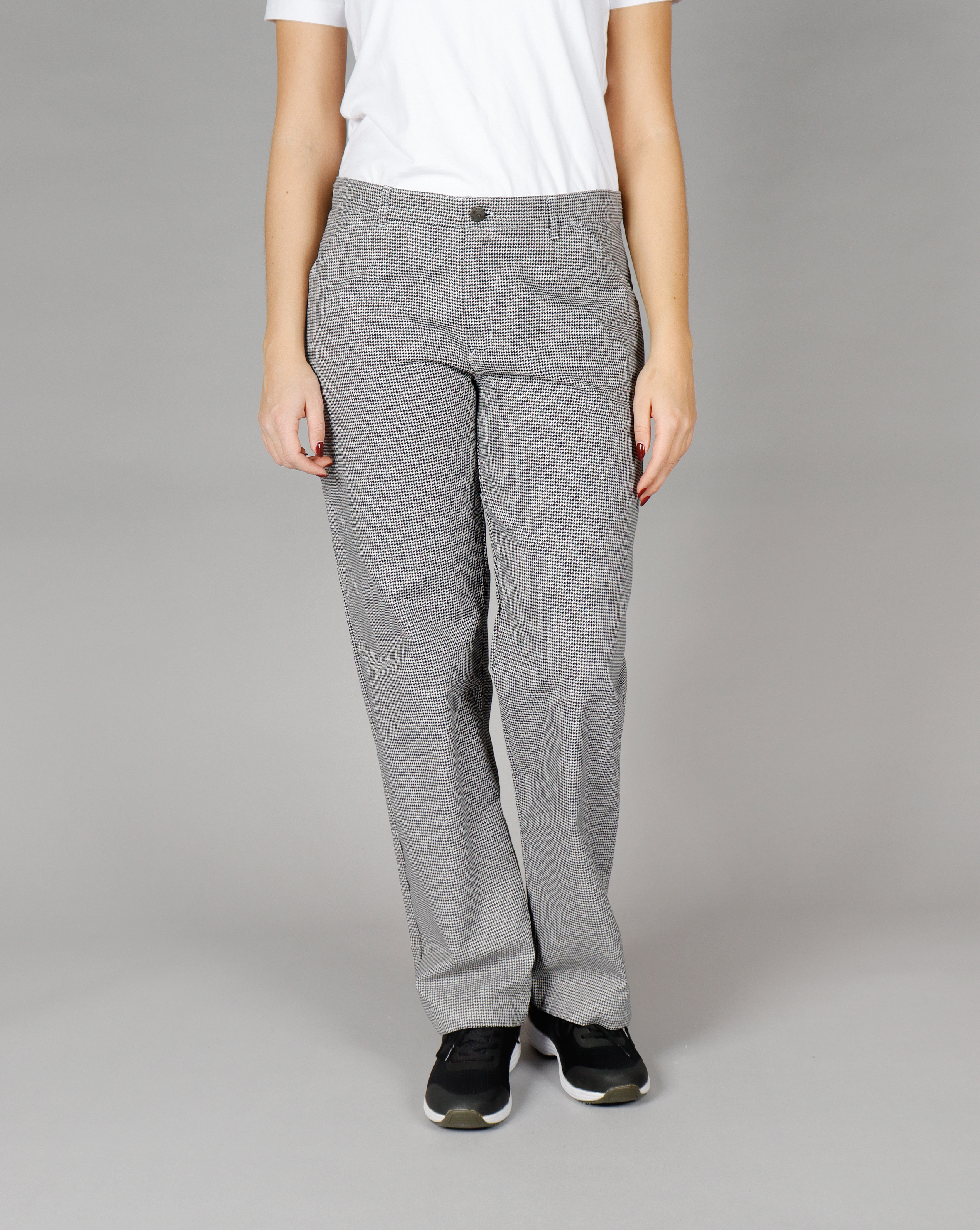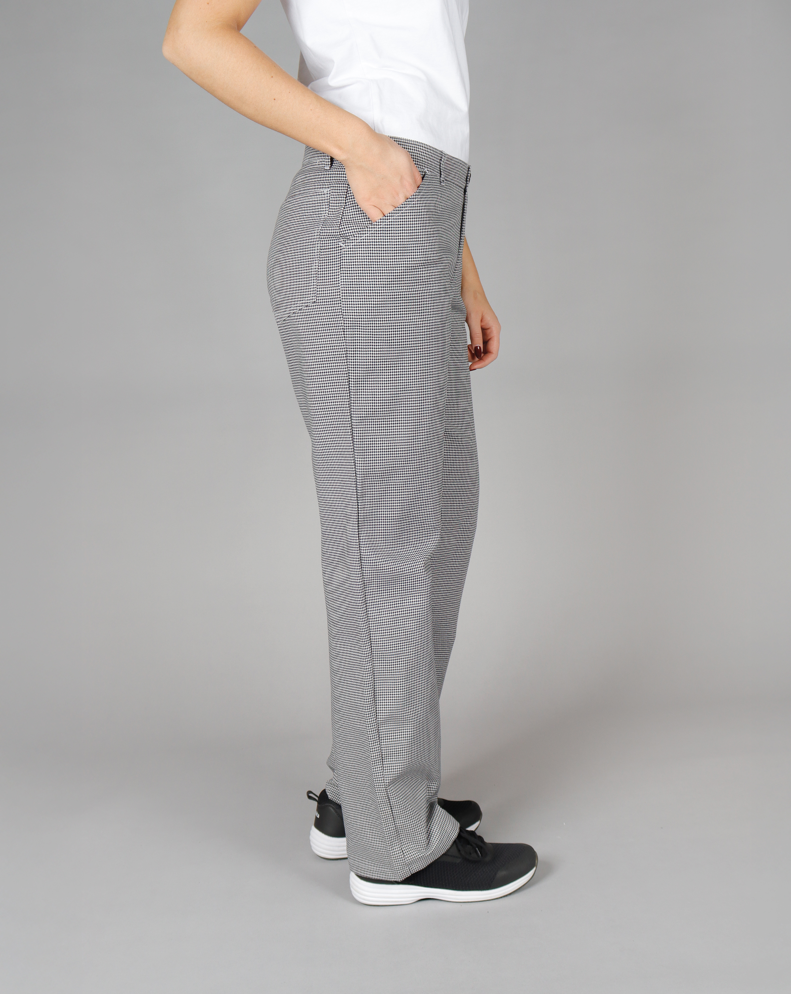 Denne klassiske damekokkebuks er fremstillet i en slidstærk og smudsafvisende metervare, som sikrer lang holdbarhed og nem vedligeholdelse. Den regulerbare elastik i linningen giver en god og fleksibel pasform, som kan tilpasses individuelt. Bukserne har skrålommer foran og to praktiske baglommer samt bæltestropper, hvilket gør dem både funktionelle og alsidige i professionelle køkkenmiljøer.