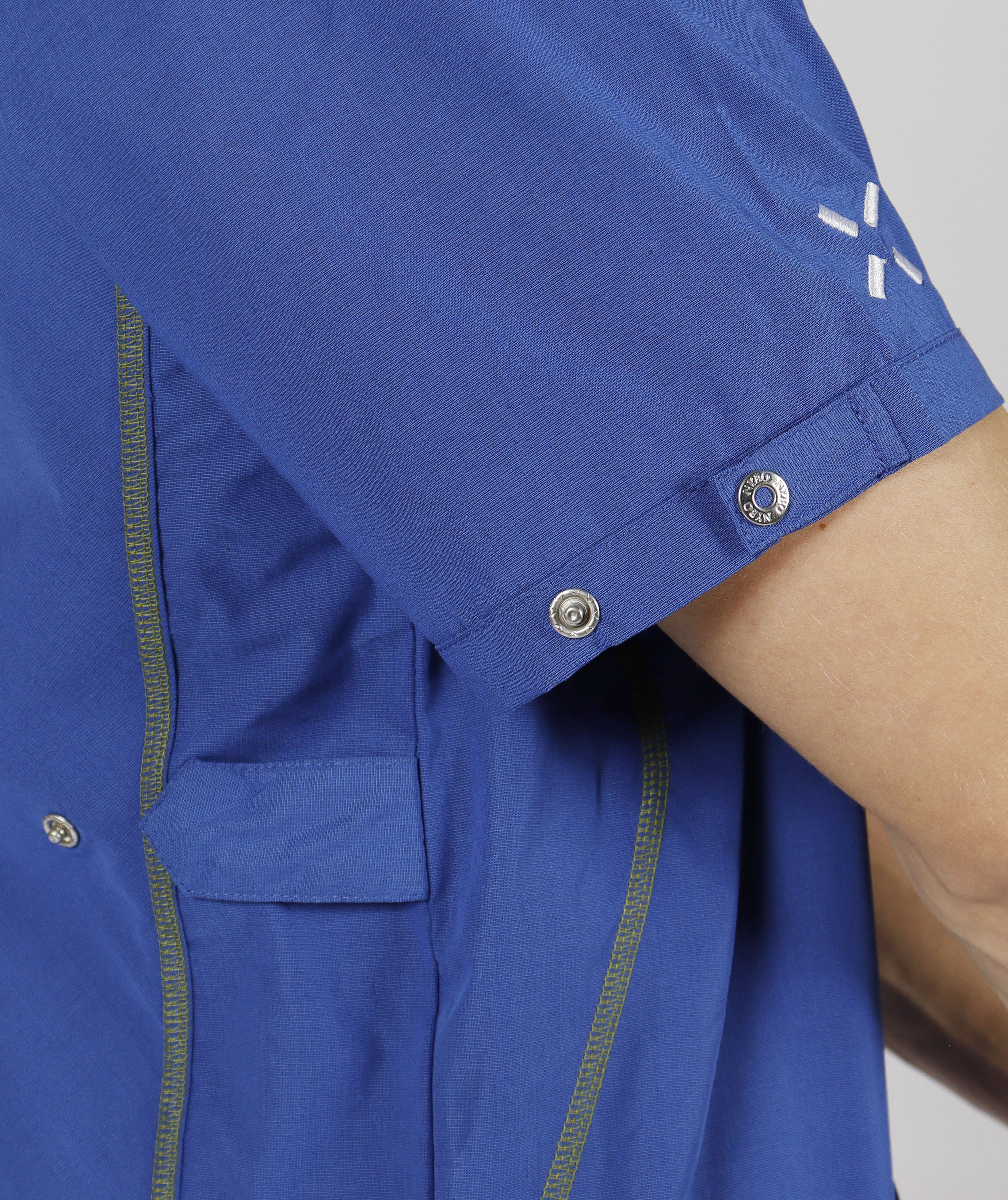 Denne unisex skjorte er designet med fokus på funktionalitet og komfort. Skjorten har rummelige lommer med trykknaplukning, herunder brystlomme med pencilstrop og hoftelommer med integrerede mobillommer og nøglestropper. Den strækbare ryg og justerbare stropper i ærmer og overvidde gør det nemt at tilpasse pasformen – både til maskuline og feminine silhuetter. Sporty linjer og fladsømme i kontrastfarve fuldender det smarte look. Kvaliteten har stretch og høj åndbarhed – perfekt til aktive arbejdssituationer.